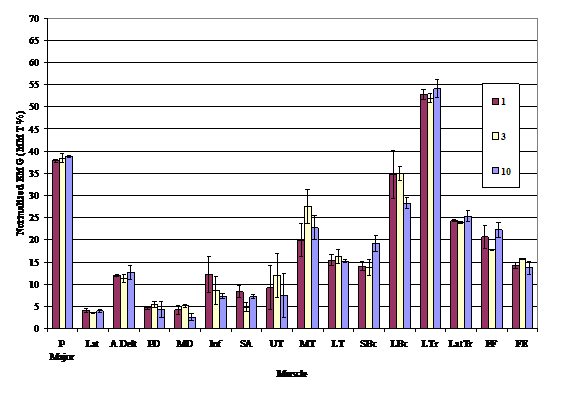All EMG data was band-passed filtered (10-400 Hz) using a fourth order, recursive Butterworth filter. The root-mean-square (RMS) of the EMG data was binned in 10ms intervals. After normalizing the data to the maximum (filtered and binned) maximum muscle activation during the manual muscle test of each muscle, averages were taken for each muscle over the three seconds of the task, establishing a normalized average RMS value representative of the amount of activity of the muscle during that particular trial. The above process was repeated for all three trials in all three positions for each subject. After getting an average RMS value for all three trials in one position, these values were averaged to represent the average amount of activity of a particular muscle in a particular position. This resulting number was used to express the amount of normalized EMG activity in each muscle expressed as a percent of the MMT task. Standard deviations of the three trial average RMS values were also calculated for each muscle. The data was analyzed in two ways: 1) The amount of muscle activity in positions 1, 3, and 10 (for each muscle) was compared within each subject to determine whether there were “between-task, within subject” differences in neuromuscular control patterns. 2) Muscle activation patterns for each subject were compared to determine if there were “between-subject, within task” differences in the neuromuscular control patterns and whether these differences can be explained through the findings in the kinematics data and physical evaluation.